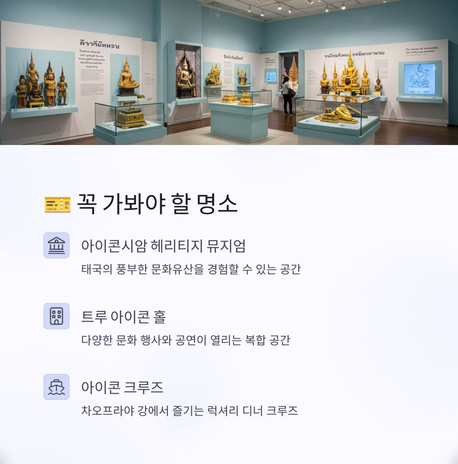 🔹 아이콘시암 헤리티지 뮤지엄: 태국의 전통과 역사를 현대적으로 재해석한 박물관으로, 하루 입장객 수가 제한되어 있어 예약은 필수입니다.