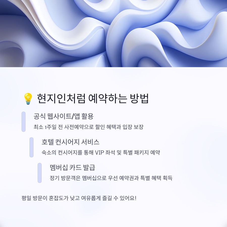 호텔 컨시어지 서비스를 이용하는 것도 좋은 방법이에요. 현지 호텔 직원들은 더 효율적인 예약 방법을 알고 있는 경우가 많습니다.