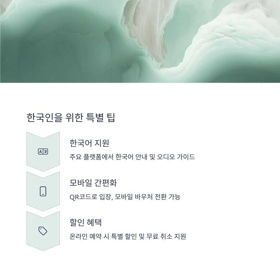 여러 여행 플랫폼 중에서도 특히 클룩(Klook)과 겟유어가이드(GetYourGuide)는 한국어 지원이 잘 되어 있고, 모바일 티켓 이용이 편리합니다.