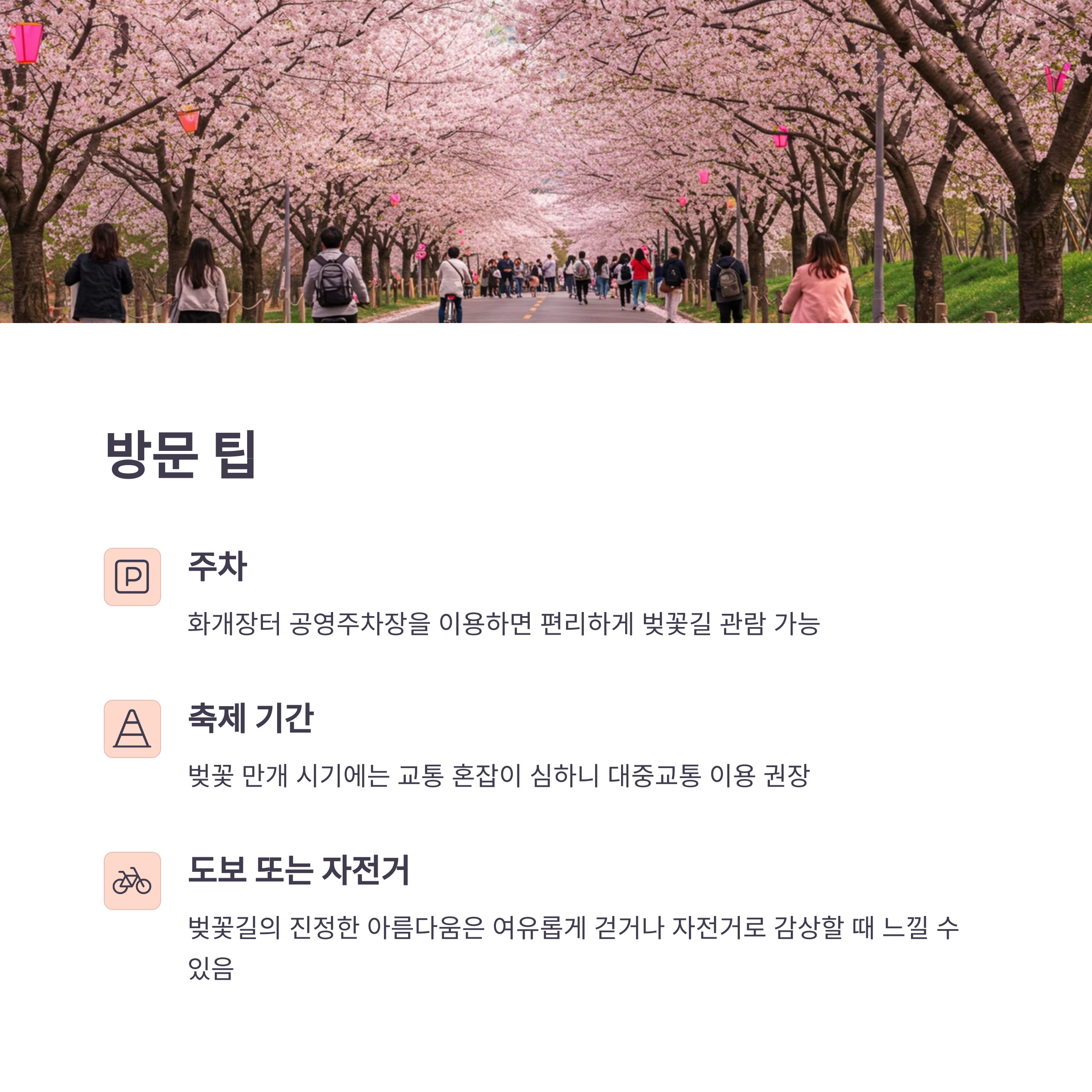 주말보다는 평일에 방문하시는 것이 한적하게 벚꽃을 즐기기에 더 좋습니다. 주말이나 축제 기간에는 상당히 많은 인파가 몰립니다.