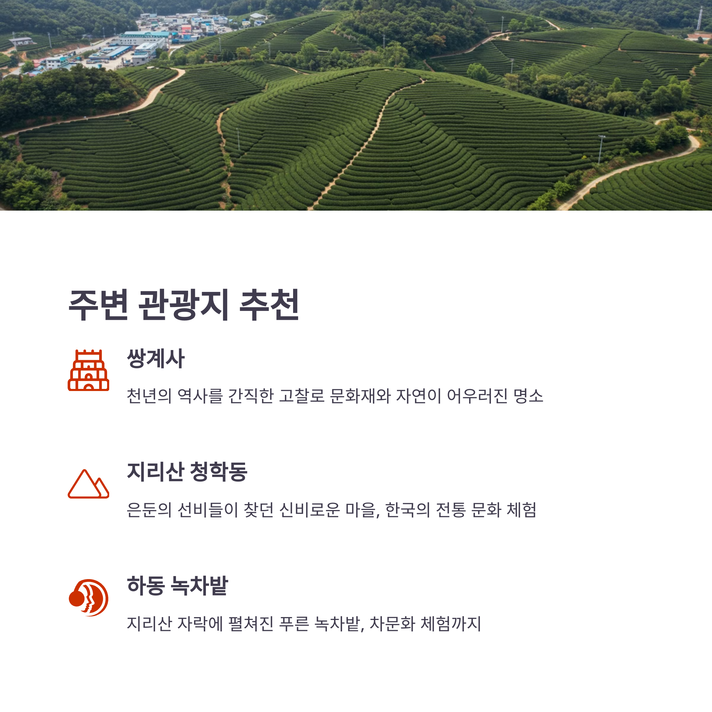 | 쌍계사, 화개장터, 지리산 청학동, 하동 녹차밭 등이 가까이 있어 함께 방문하기 좋습니다. |