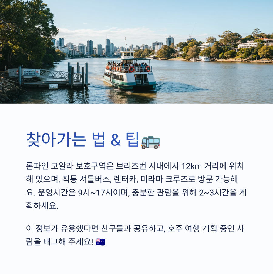 좀 더 특별한 경험을 원하신다면 브리즈번 강을 따라 운행되는 미라마 크루즈를 이용해보세요. 아름다운 강 풍경을 감상하며 론파인까지 갈 수 있어 색다른 경험이 될 거예요! 🚢