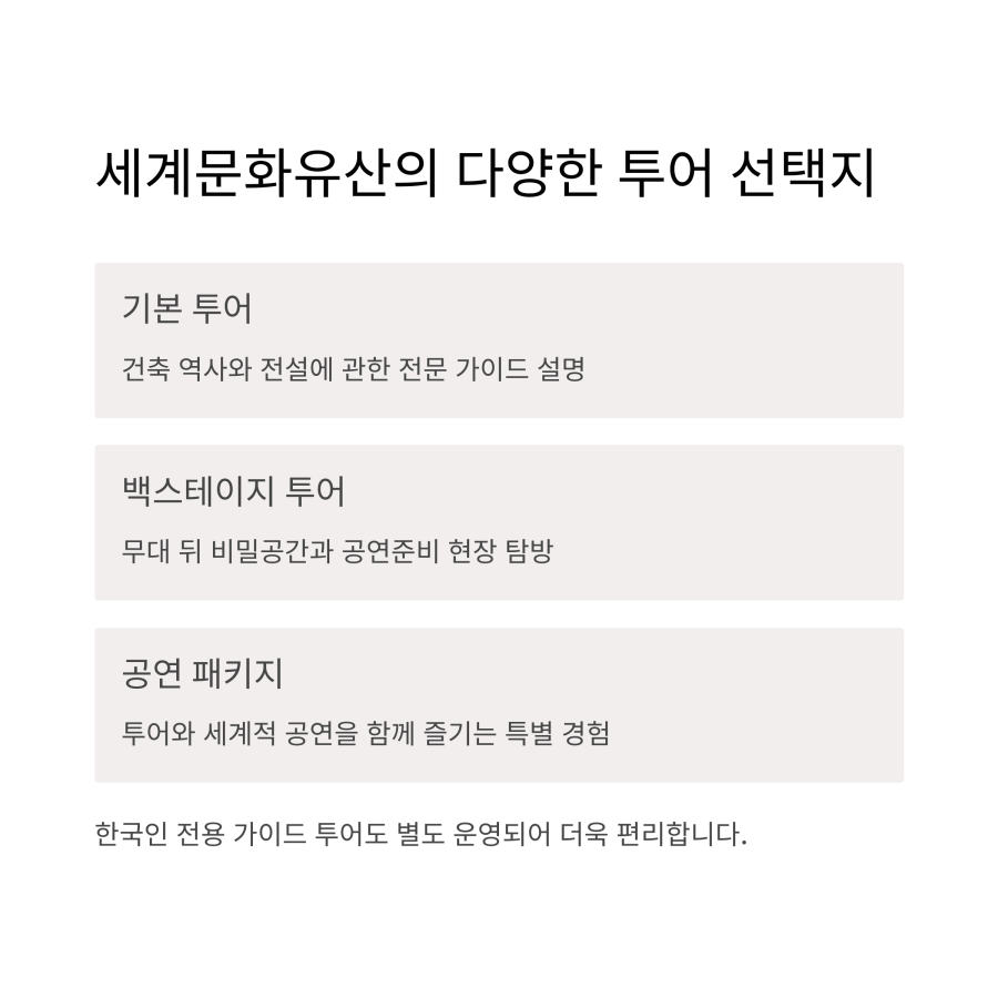 특히 공연장 내부와 리허설 현장까지 볼 수 있는 백스테이지 투어는 조금 비싸지만 정말 특별한 경험이었어요! 공연예술에 관심이 많으신 분들께 강력 추천해드립니다.