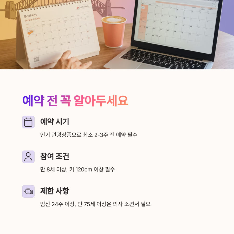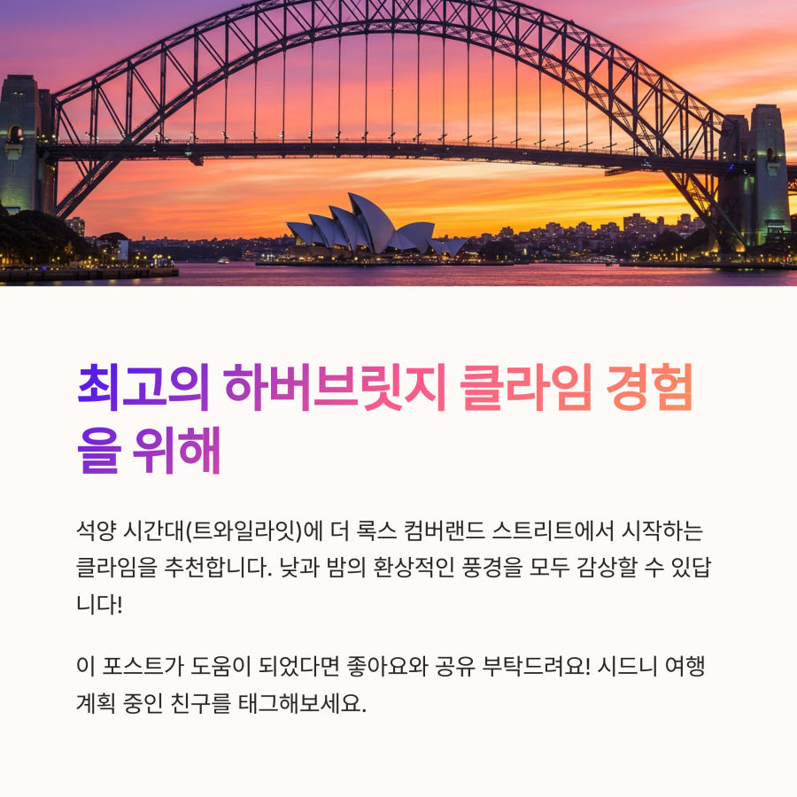 여행은 계획이 반이라고 하죠? 미리 예약하고 준비해서 시드니에서 가장 짜릿하고 아름다운 경험을 놓치지 마세요. 여러분의 시드니 여행이 하버브릿지 클라임과 함께 더욱 특별해지기를 바랍니다!
