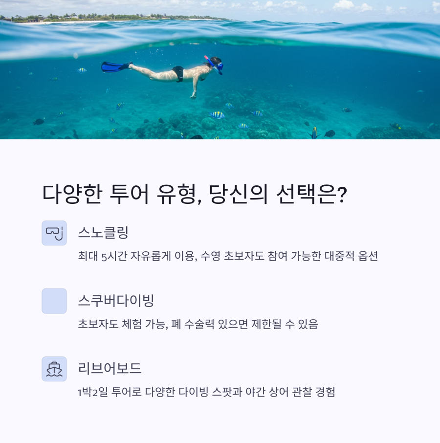 초보자부터 전문가까지 모두 즐길 수 있는 스노클링 투어가 있고, 자격증이 있으신 분들은 정식 다이빙 투어를 선택하실 수 있어요.