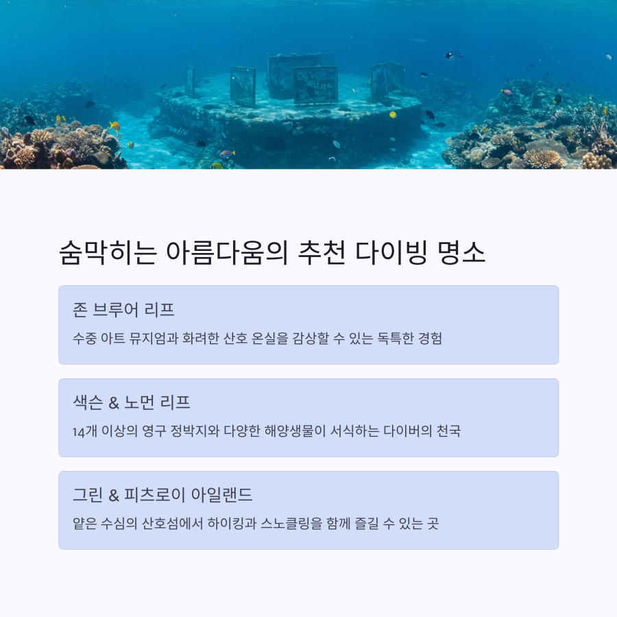 또한 다이빙 경험이 없으신 분들을 위한 체험 다이빙도 있답니다. 전문 강사와 함께하는 체험 다이빙은 자격증 없이도 안전하게 수중 세계를 탐험할 수 있는 좋은 기회예요.