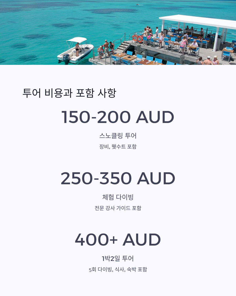 가격은 업체와 투어 종류에 따라 다양하지만, 일반적으로 스노클링 투어는 150-200 호주달러, 체험 다이빙은 250-350 호주달러, 자격증 다이빙은 200-300 호주달러 정도예요.