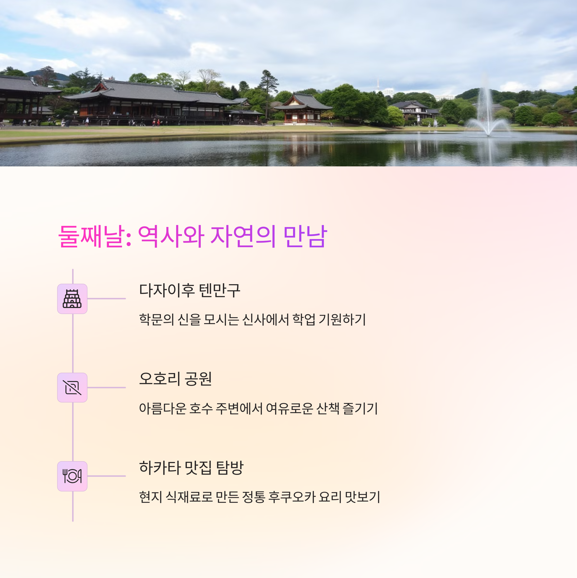 🚆 아침에는 다자이후 텐만구로 향해보세요. 학문의 신을 모신 신사로, 지하철과 전철을 이용해 약 30분이면 도착해요.