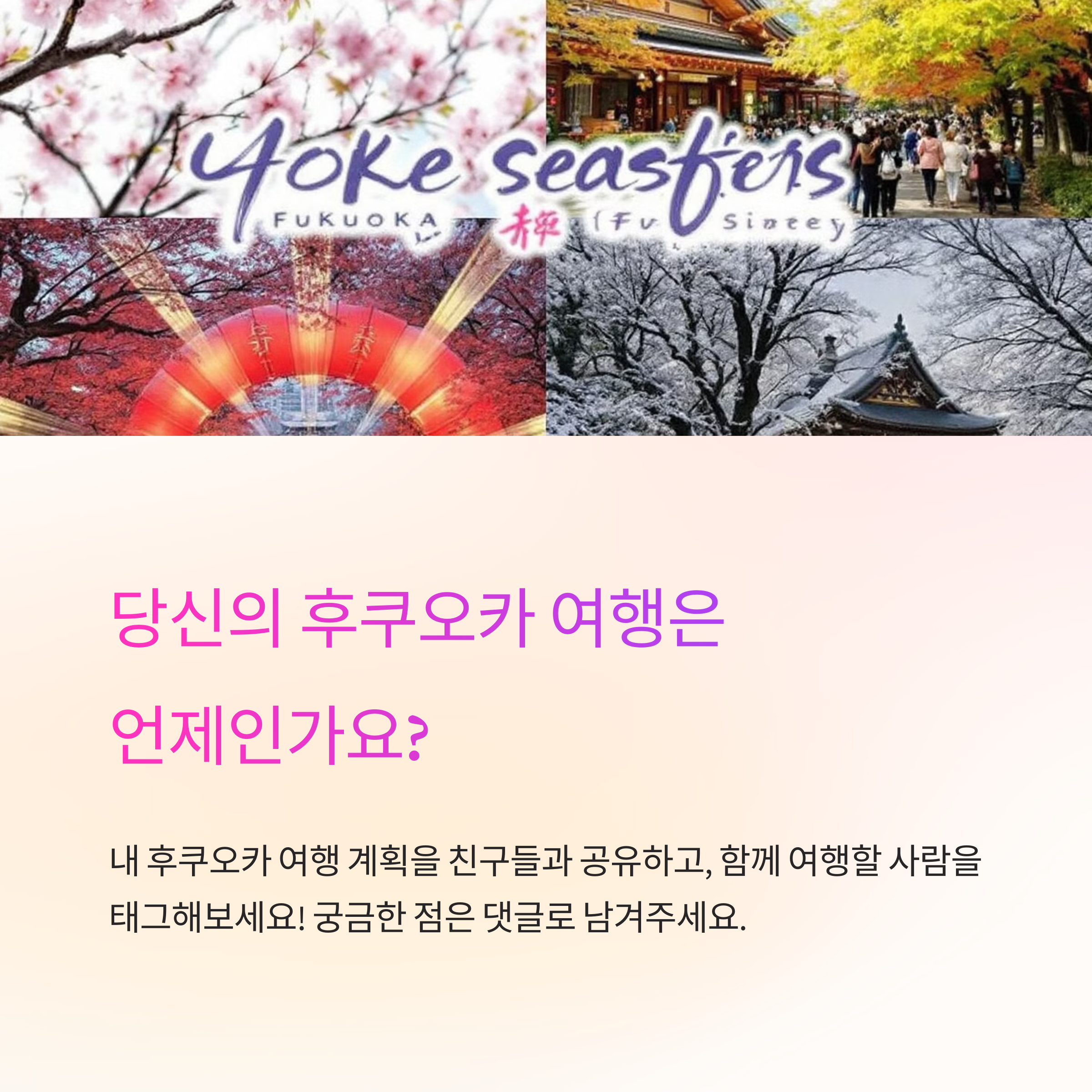 | 후쿠오카 여행에 가장 좋은 시즌은 언제인가요? | 봄(3-5월)과 가을(10-11월)이 날씨가 온화해서 여행하기 가장 좋아요. 여름은 습하고 더울 수 있고, 겨울은 춥지만 크리스마스 이루미네이션이 예쁘답니다! |
