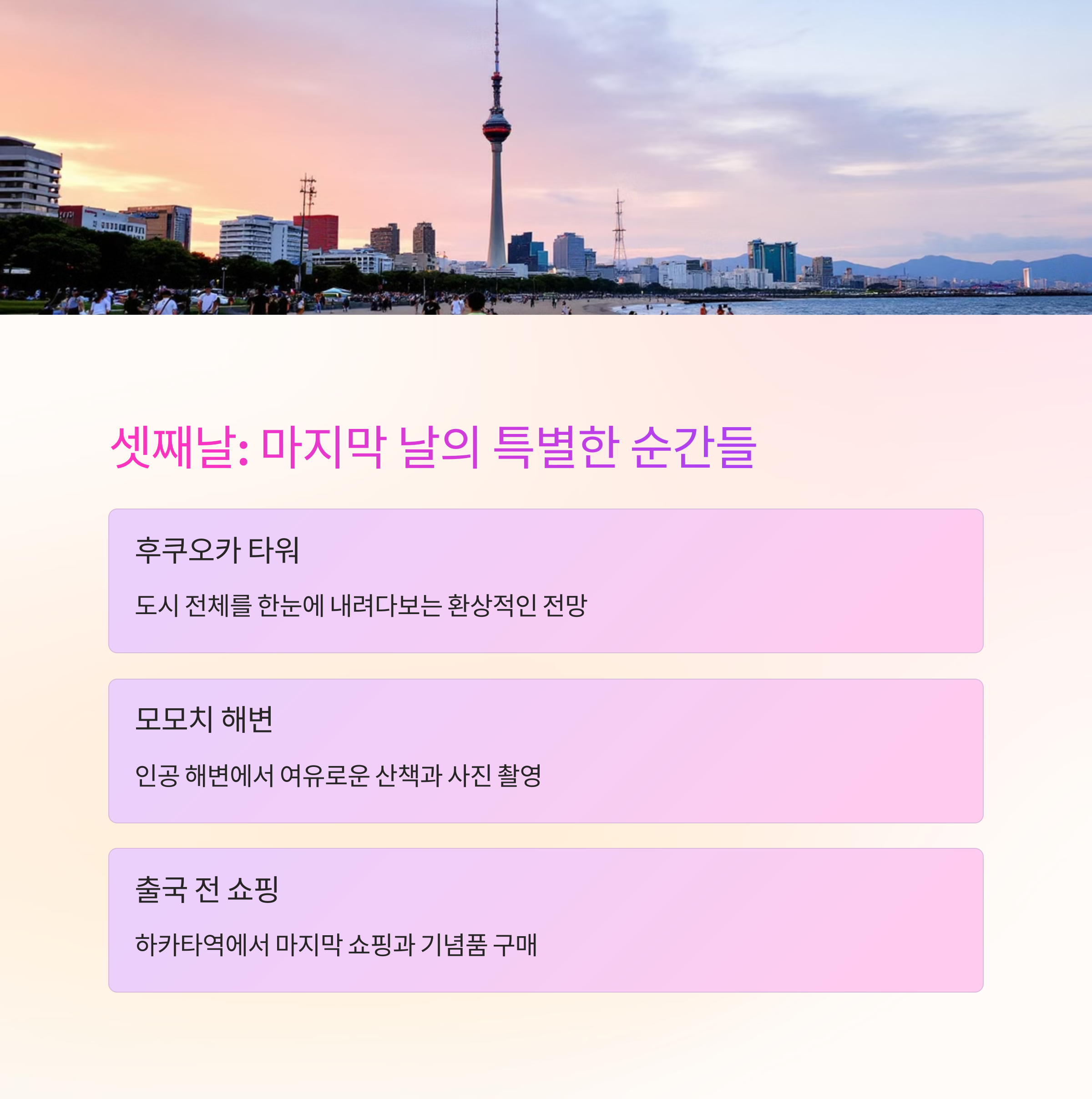 다음에는 큐슈의 다른 매력적인 도시들까지 연계해서 더 긴 여행을 계획해보는 것도 좋을 것 같아요. 여러분의 즐거운 후쿠오카 여행을 응원할게요!