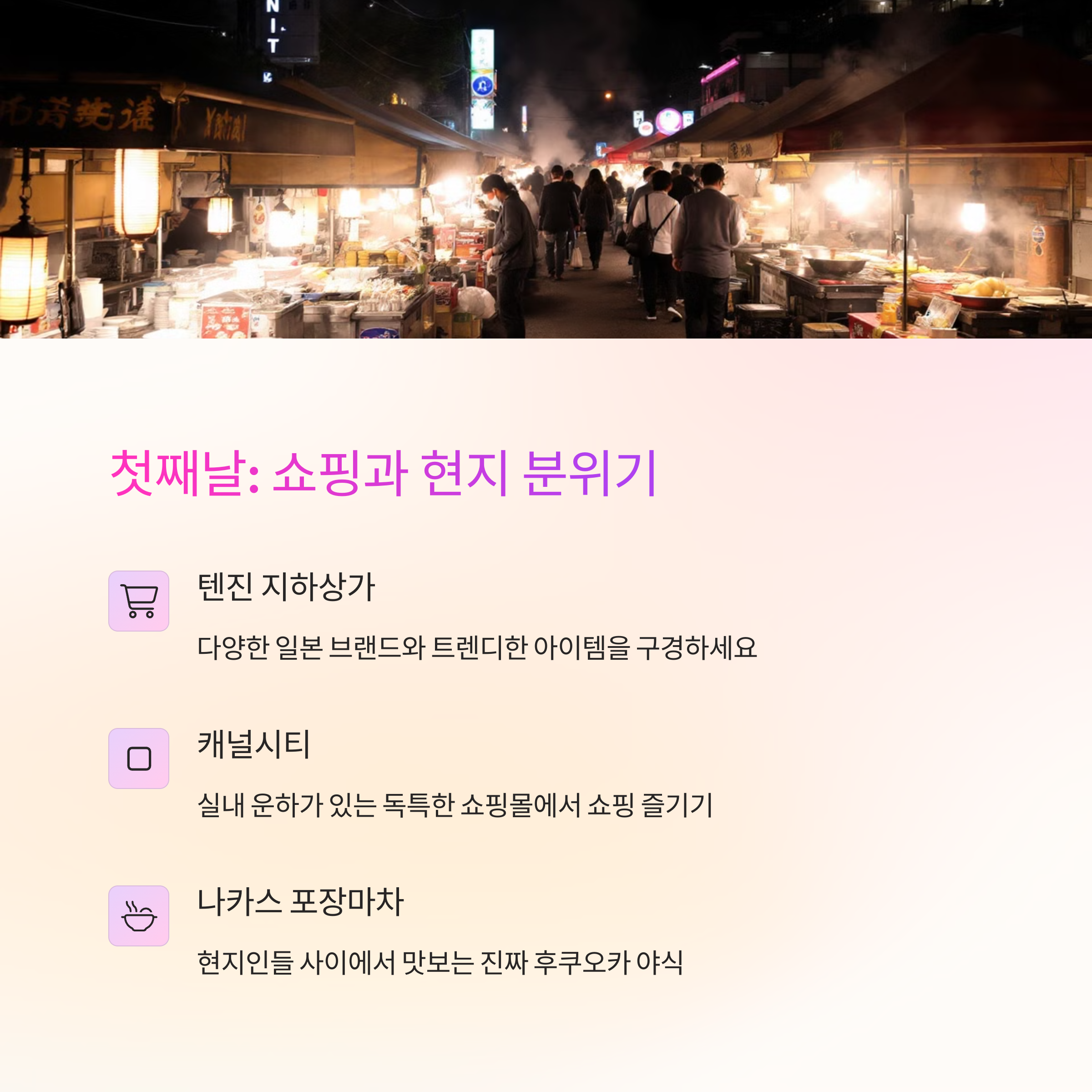 🚶♀️ 텐진 지역은 후쿠오카의 쇼핑과 먹방의 중심지예요. 텐진 지하상가에서 쇼핑하고, 점심으로는 유명한 하카타 라멘을 꼭 맛보세요!