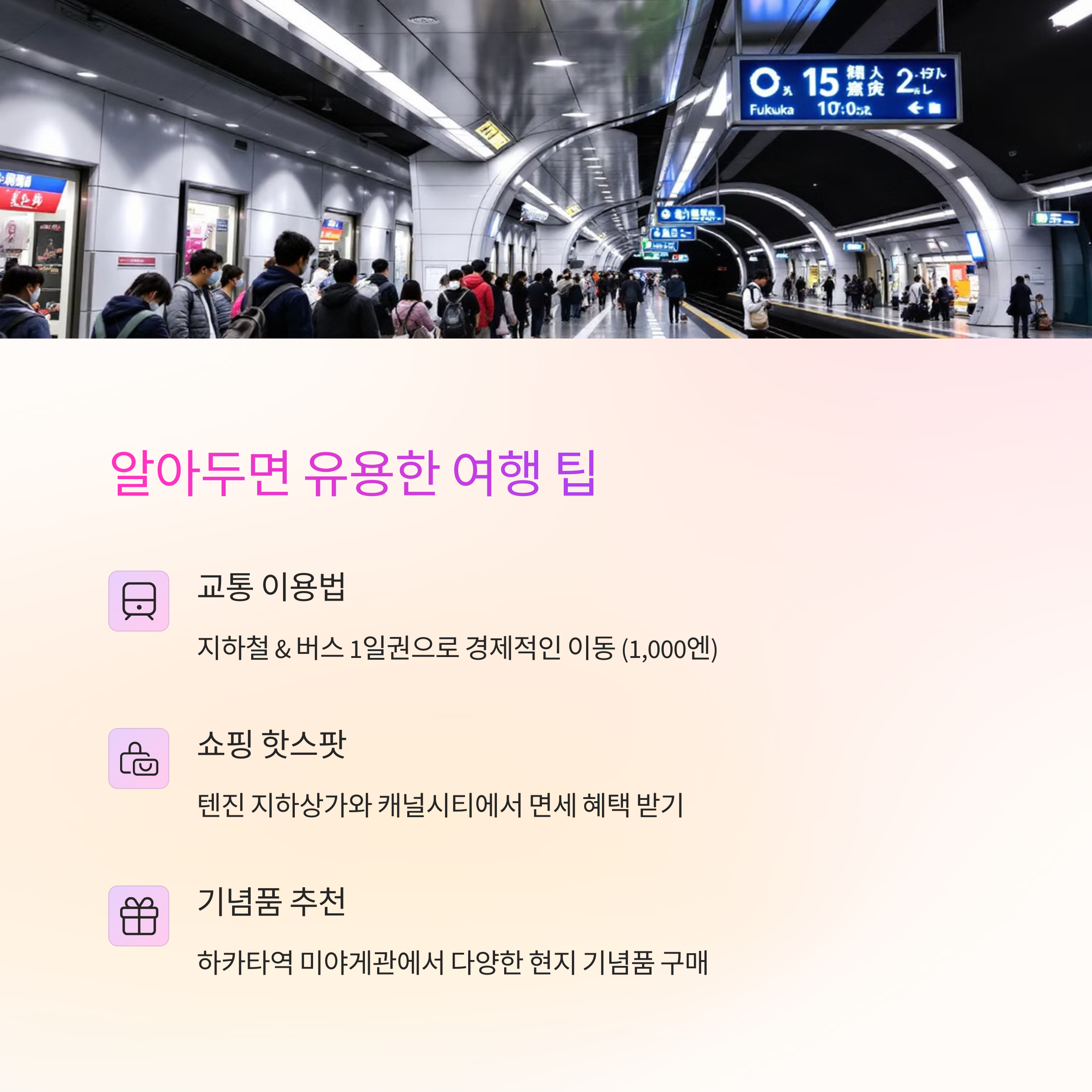 | 후쿠오카에서 교통은 어떻게 이용하는 것이 좋을까요? | 지하철과 버스가 잘 발달되어 있어요. 지하철 1일 패스(720엔)를 구매하면 무제한 이용할 수 있어 경제적이에요. 택시는 비싼 편이지만 늦은 밤이나 짐이 많을 때 편리해요! |