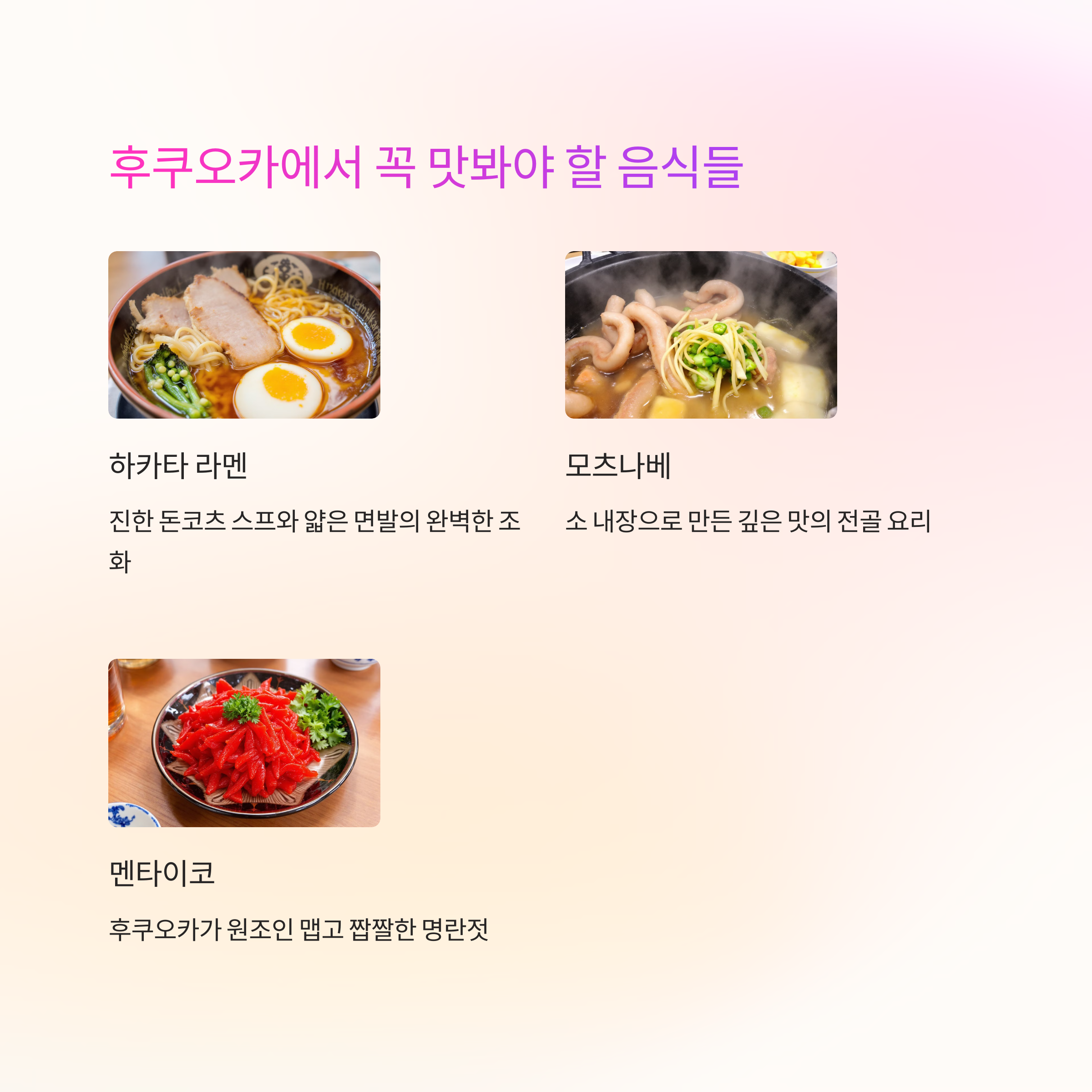 | 후쿠오카에서 꼭 사야 할 기념품은 무엇인가요? | 멘타이코(명란젓)와 멘타이코 과자, 하카타 인형, 아마오우 딸기 과자 등이 인기 있어요. 돈키호테나 마츠모토 키요시에서 쉽게 구매할 수 있답니다! |