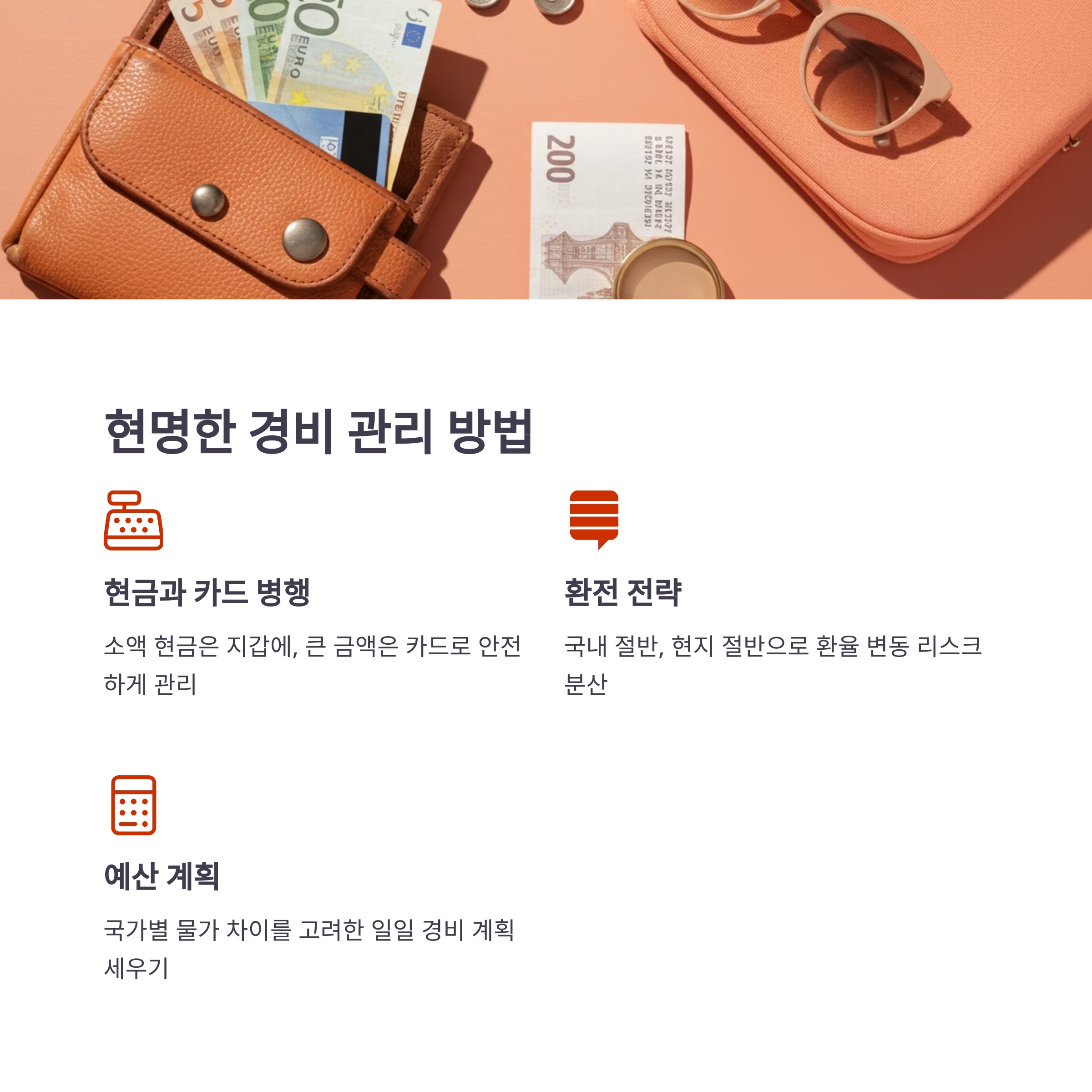 유럽 여행에서 효율적인 경비 관리는 여행의 질을 좌우합니다. 현금과 카드를 적절히 조합해 사용하는 것이 좋아요.