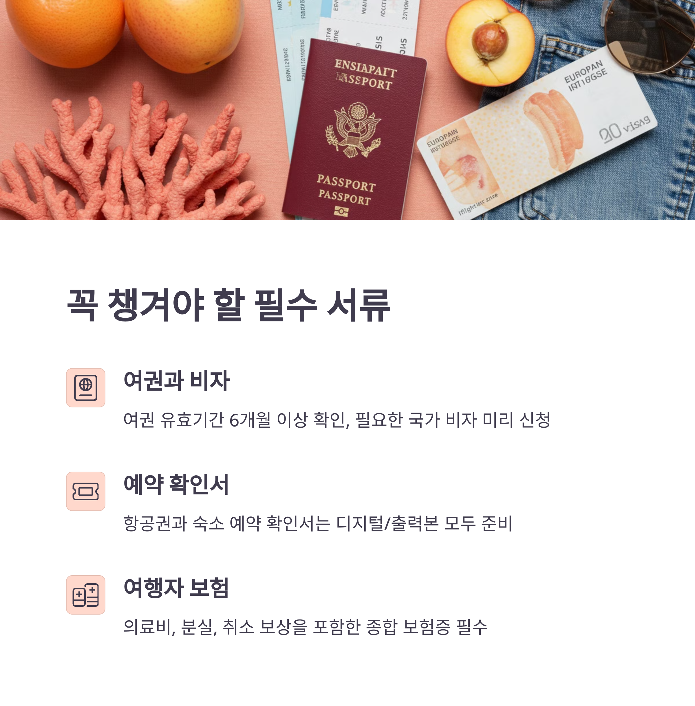 또한 예약 확인서나 보험 관련 서류도 미리 준비해두면 여행 중 발생할 수 있는 여러 문제를 예방할 수 있어요.