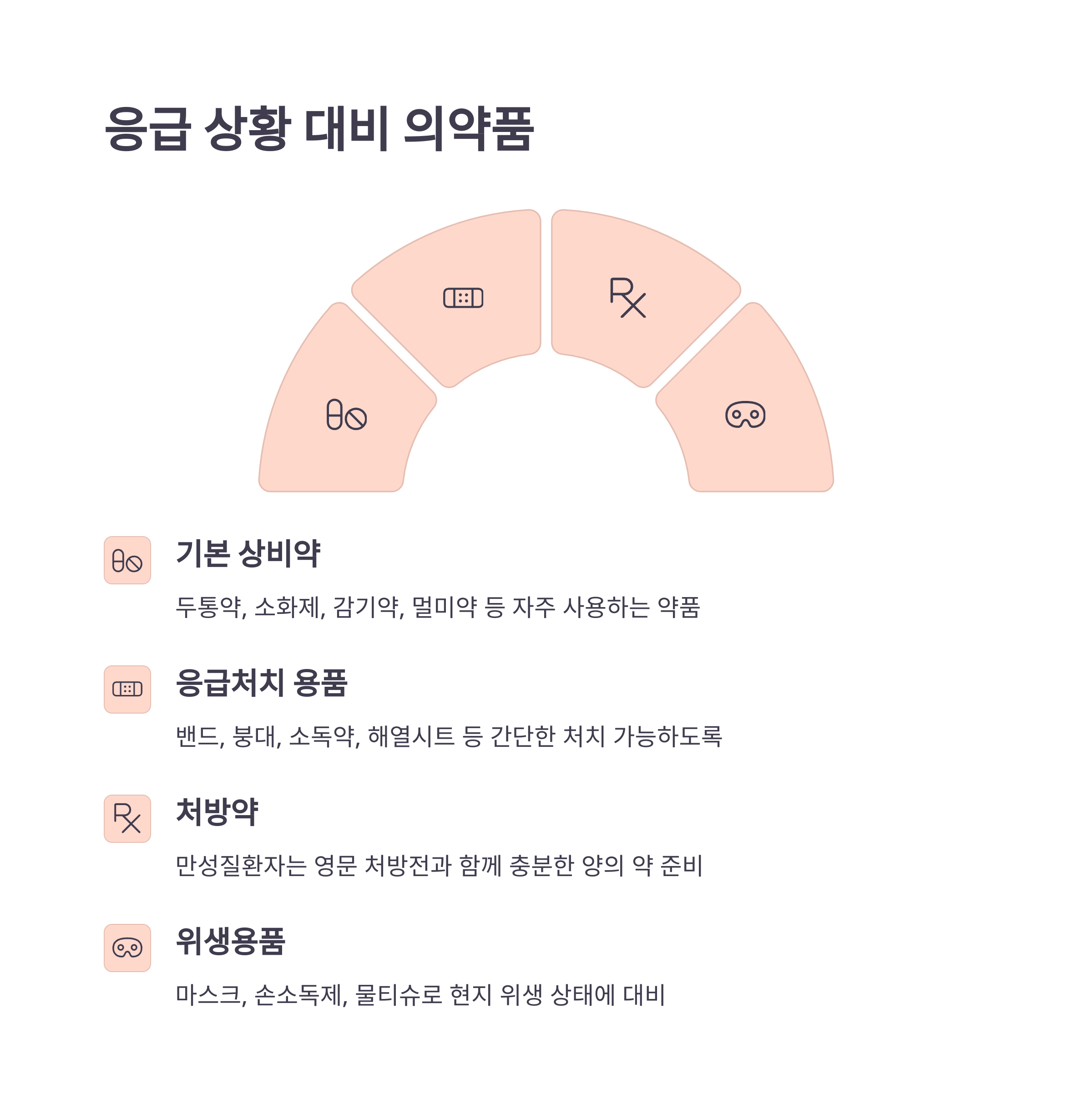 평소 복용하는 약이 있다면 처방전과 함께 여행 기간보다 여유 있게 준비하세요. 갑작스러운 질병이나 통증에 대비할 수 있는 기본 약품도 필수입니다.