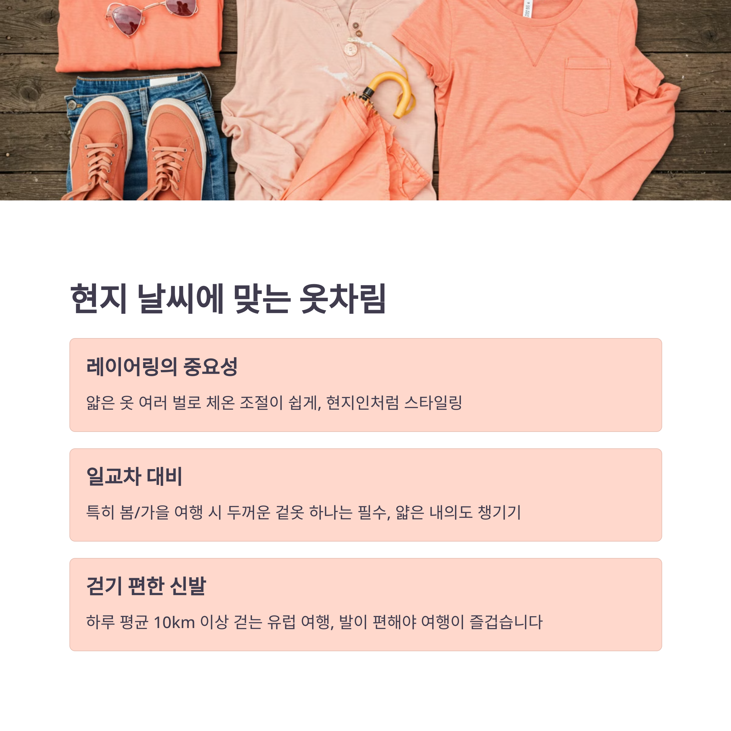 유럽은 지역과 계절에 따라 날씨가 크게 다르기 때문에 여행 시기에 맞는 적절한 의류 준비가 필요합니다.